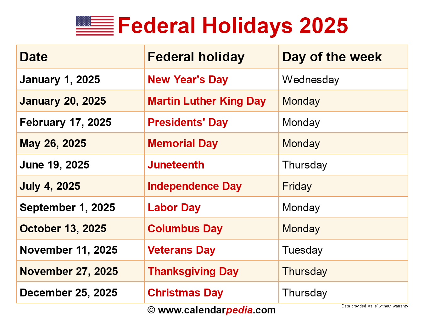 In 2025, the federal holidays are: New Year’s Day (January 1), Birthday of Martin Luther King, Jr. (January 20), Washington’s Birthday/Presidents Day (February 17), Memorial Day (May 26), Juneteenth National Independence Day (June 19), Independence Day (July 4), Labor Day (September 1), Columbus Day/Indigenous Peoples’ Day (October 13), Veterans Day (November 11), Thanksgiving Day (November 27), and Christmas Day (December 25).[2][3][8]