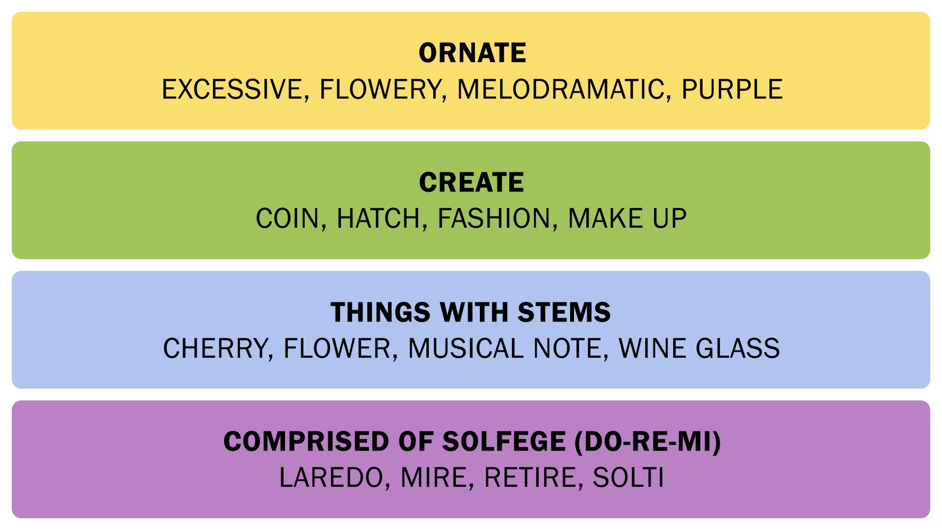 In today’s Connections puzzle, the purple (hardest) group consists of Laredo, Mire, Retire, and Solti, explained by solution guides as “comprised of solfege (do-re-mi).” That means every word in the set contains one or more of the familiar scale syllables when you listen closely.