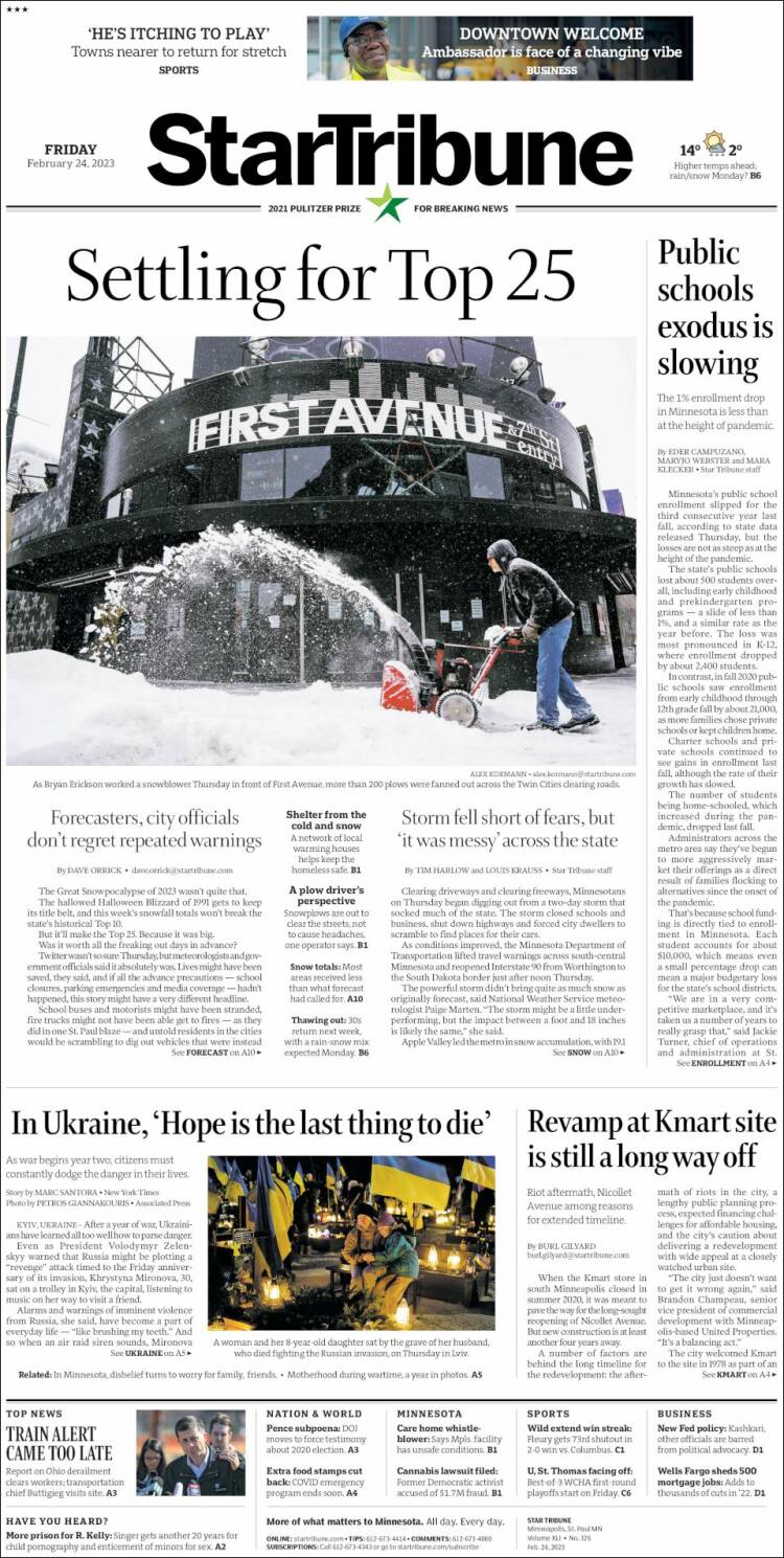 Because severe weather shapes daily routines in Minnesota, Star Tribune’s coverage of snowstorms, cold snaps and emergencies is a key public‑service function.[1][2][3] Recent stories detailed snow emergencies, airport disruptions and traffic crashes during winter storms, as well as subsequent cleanup and infrastructure challenges, helping readers make informed decisions about travel and safety.[1][2][3]
