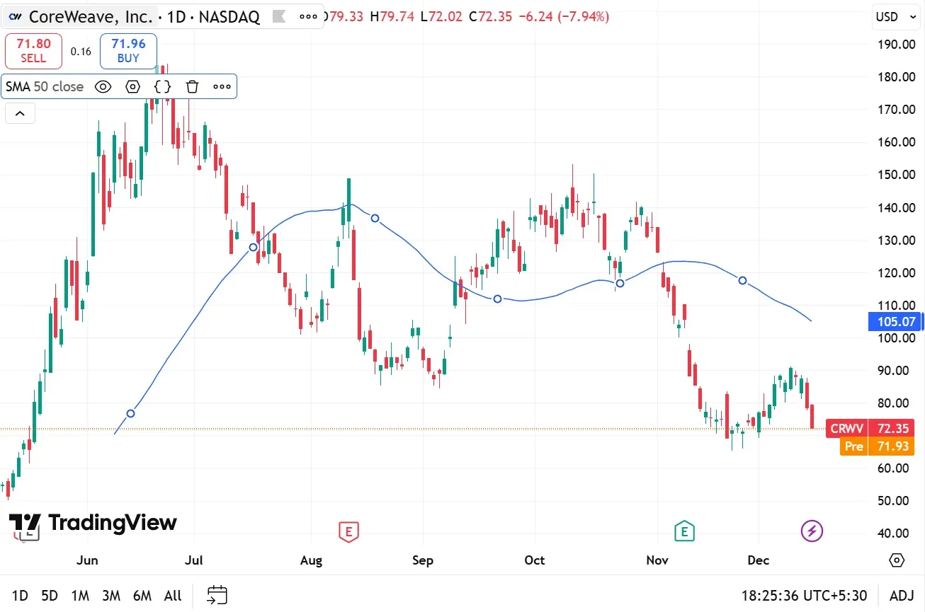 Prior to today's gains, CRWV dropped 22.5% in the week before December 19, 2025, due to sector weakness, heavy debt, and concerns over aggressive spending tied to Nvidia chips. Investors questioned long-term sustainability amid persistent losses.