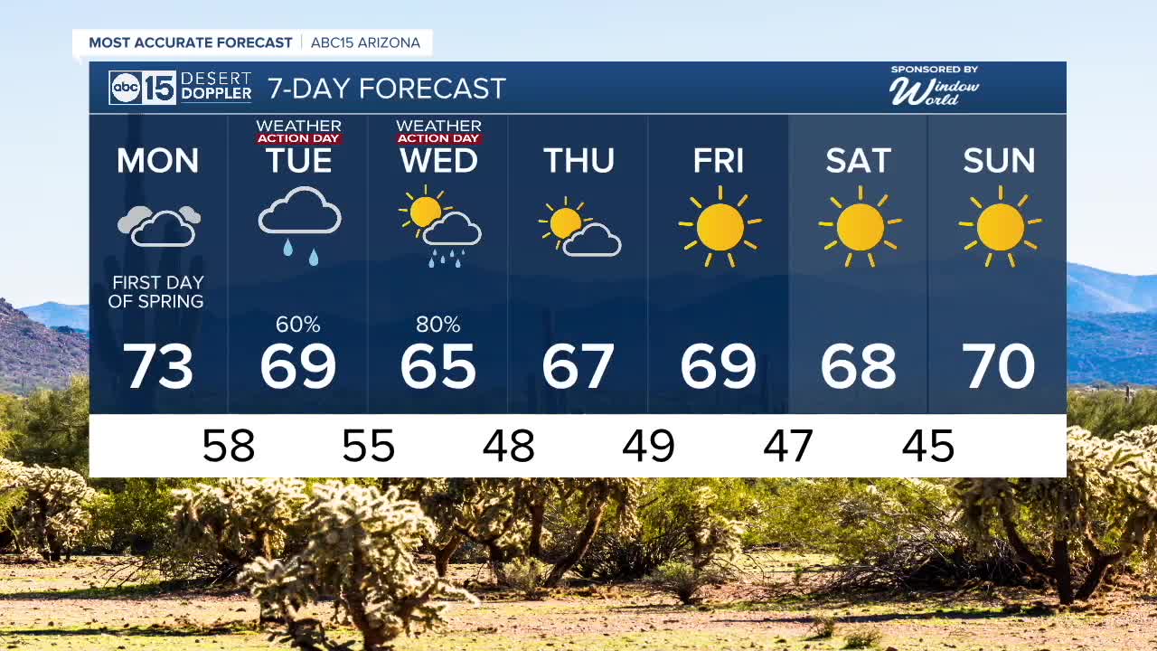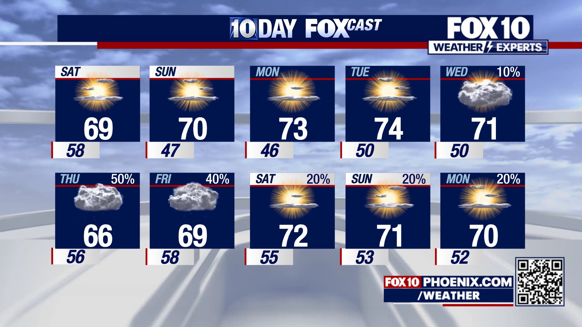 Phoenix's December 2025 forecast shows consistent mild conditions, with today's 69-70°F high matching the monthly pattern of 64-74°F averages. Lows hover around 45-52°F, with only a few rainy days expected overall.[3]