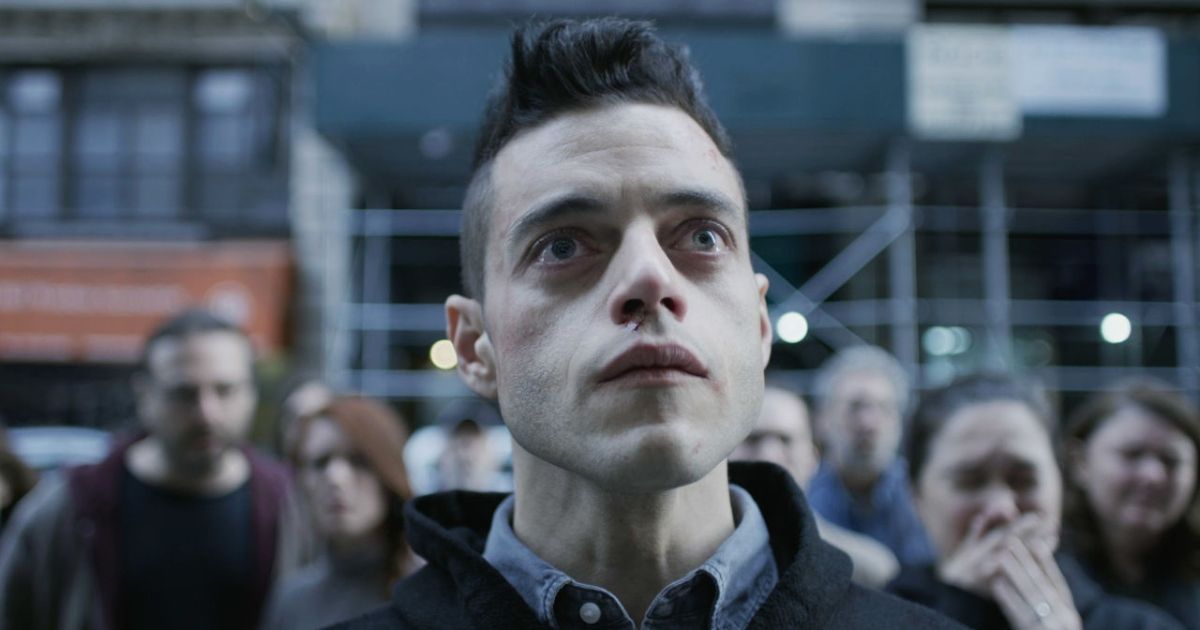 Supporting cast includes Portia Doubleday as Angela, Carly Chaikin as Darlene, and Martin Wallström as Tyrell Wellick. The narrative delves into Elliot's dissociative identity disorder, blending thriller elements with philosophical questions on free will and capitalism.
